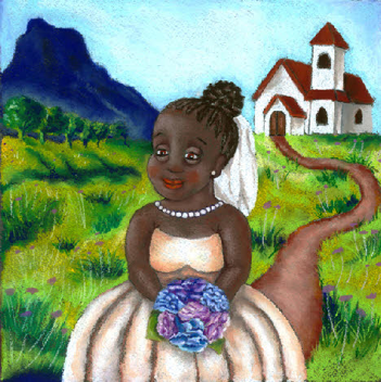 [Helga] This first piece was created with Caran d’ Ache oil pastels on Fabriano paper. I particularly enjoyed doing this illustration for  a few reasons. Firstly, I love drawing African woman. I think they are intrinsically beautiful and they  know it! Their quiet confidence and radiance inspires me so much. Also, this composition seemed to simply flow out from onto the paper and every artist will tell you how much they love it when this happens. Now that I’ve done my illustration course the perspective on the Church really bugs me. I’m sure my tutor would be thrilled to know his lessons are making an impact!